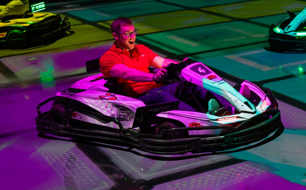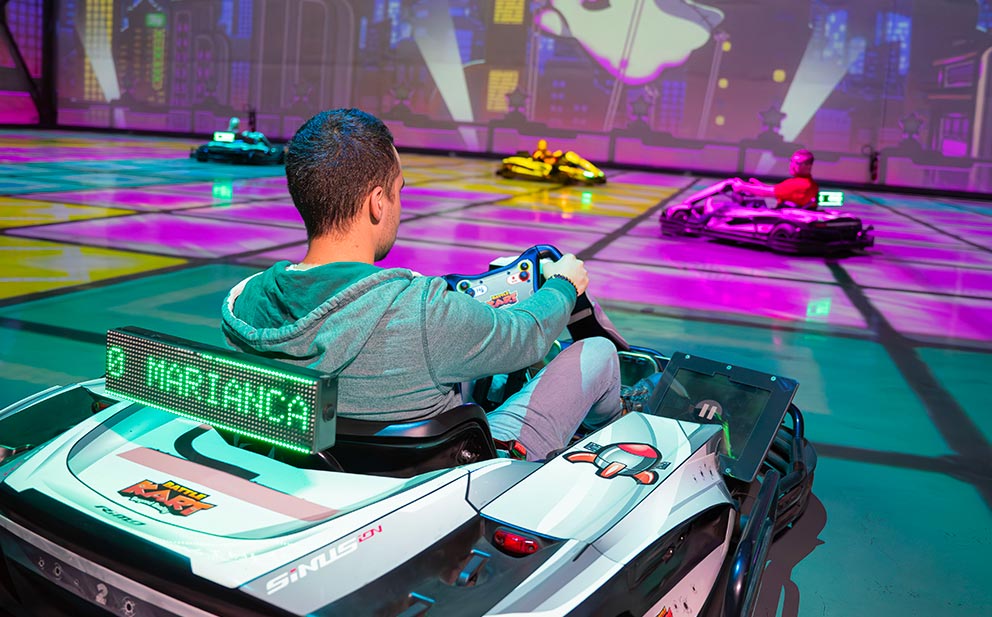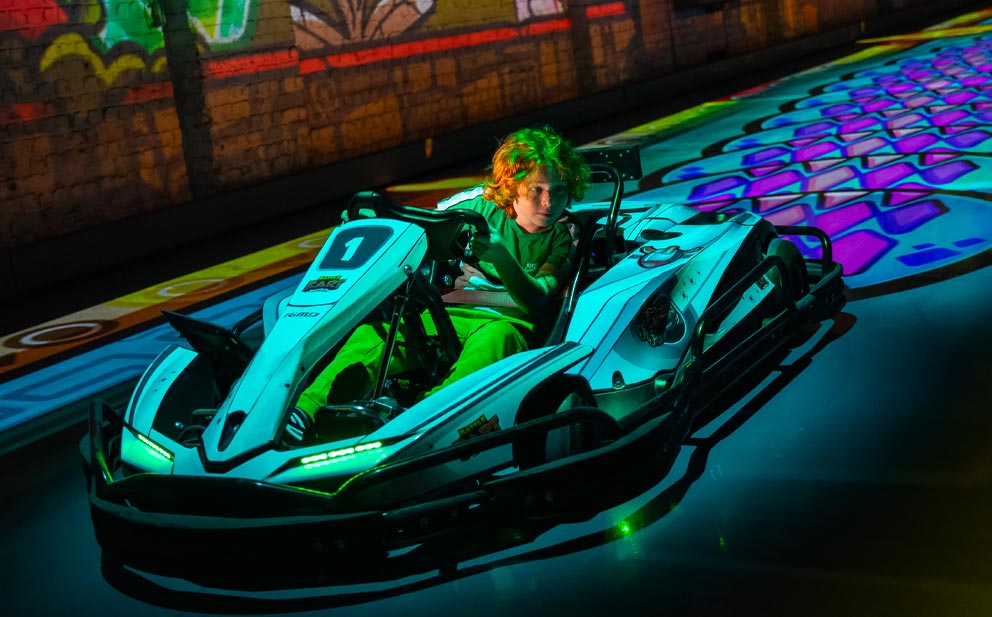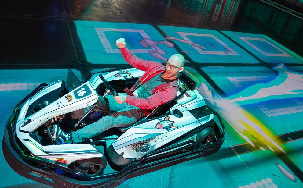 A bord de ton puissant karting électrique, roule plein gaz et interagis avec les décors et bonus virtuels projetés au sol, affronte tes adversaires et déploie tes talents de joueur et de pilote pour remporter la partie !